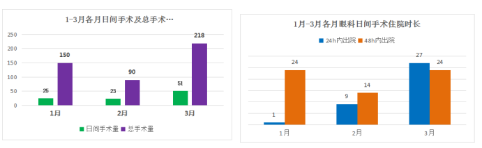 从2021年1月1日起眼科日间手术共开展包括白内障、玻璃体腔注射、翼状胬肉联合自体角膜缘干细胞移植、斜视及眼睑、眼眶7大类眼科疾病,手术例数从1月份25例达到3月份51例,占全科手术的23.4%。不但日间手术数量稳步增加,而且住院时间大幅度缩短,从1月份4%日间手术患者24小时内出院到3月份53%日间手术24小时内出院,其中白内障手术患者最快5小时即完成入院、手术、术后观察、出院全部流程。