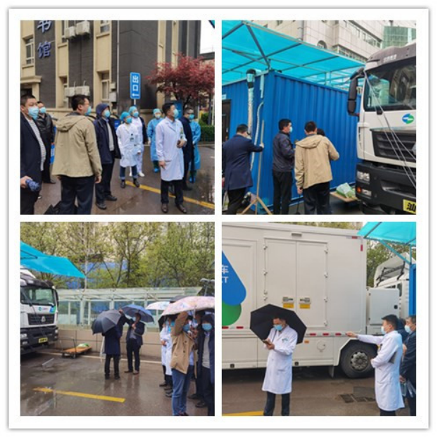 为确保移动CT影像车顺利如期投入发热门诊使用,根据院领导指导要求,4月2日下午,冒着一直不停歇的春雨,段降龙院长助理带领医务处,组织门急诊医技管理处、急救与应急管理处、信息处、总务处、保卫处、医学装备部、后勤服务中心、CT室、感染性疾病科等相关部门和科室对移动CT影像车安置及快速使用、早日服务患者等工作进行现场办公。