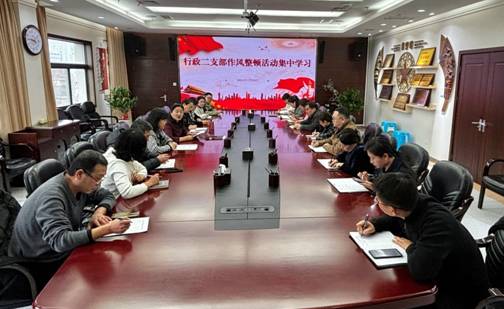 行政后勤系统管理质效提升动员会后迅速响应、立即行动,在行政党总支书记郑安丽指导和院办主任张真妮带领下,严格按照行政党总支作风整顿活动学习安排,分班组进行集中学习,院办副主任李晔主持,各岗位人员参与。