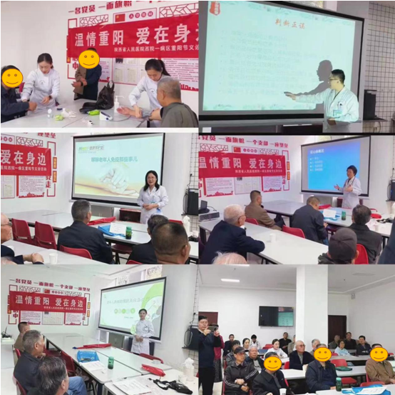 活动中,赵媛主任讲解了老年免疫科普知识及秋冬季老年人高发疾病的居家管理方法,从评估、优化治疗及并发症的管理方面进行了详细介绍。医护团队同时讲解了冠心病、骨质疏松的科普知识,列举了正确预防疾病的防控点,以及居家老年人如何预防跌倒及应急处理的注意事项,为老年人健康的生活方式做出了指导。