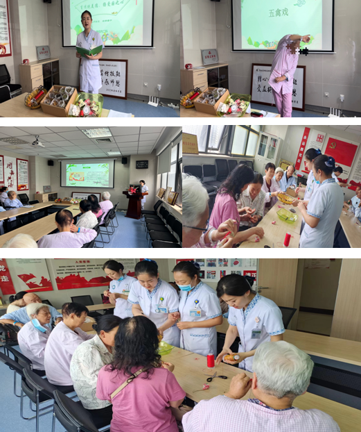王舒妍主管护师介绍了端午节的由来及风俗文化,随后以“纪念屈原”为题,大家开展了诗歌朗诵、临摹粽子以及制作香囊、编五彩绳等一系列活动。最后,患者陈奶奶的五禽戏表演将活动推向高潮,活动在护患掌声和欢笑声中圆满落幕。