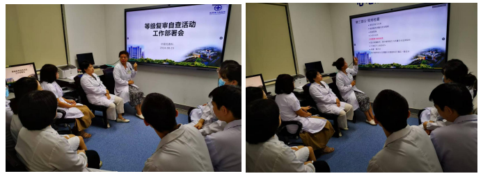 等级复审工作的当前进展进行了全面介绍,强调了自查工作的重要性并要求各组长和科室业务骨干牵头,联动全科室人员,结合科室实际情况,全面梳理评审细则,确保自查工作的全面性和深入性。