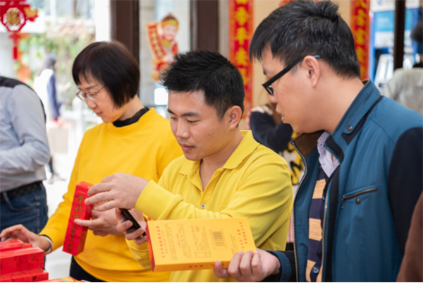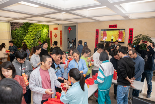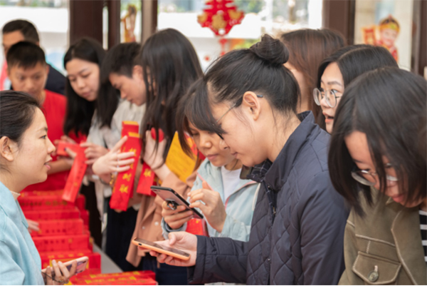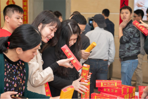 本届活动增设线上线下两个环节。线上环节,职工将活动链接及定位分享至朋友圈,参与企业微信“2019我最喜爱的团青活动”投票,即可获赠精美春联一对。在线下环节,增设“祝福比拼”游戏互动,参与游戏活动的职工两人一组,抽取相应汉字卡,在游戏板上组成3组四字祝福语,最先完成的可获得“大福字”。活动过程中,不断有职工闻讯赶来,现场紧张激烈,火热比拼,不时爆发出阵阵笑声和热烈地掌声。