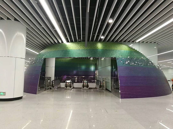 星球2:为突出车站交通核心,在站厅中部下站台扶梯与疏散楼梯组合处,设置通过层层颜色渐变波纹不锈钢弯通叠加而成的半球体,穿越球体口部可经过扶梯下达站台。球体表面设有镜面不锈钢“花鸟鱼虫”艺术构件,丰富车站的艺术与想象空间。