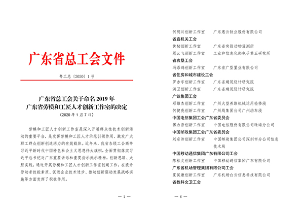 1.广东省总工会关于命名 2019 年广东省劳模和工匠人才创新工作室的决定(粤工总〔2020〕1号)