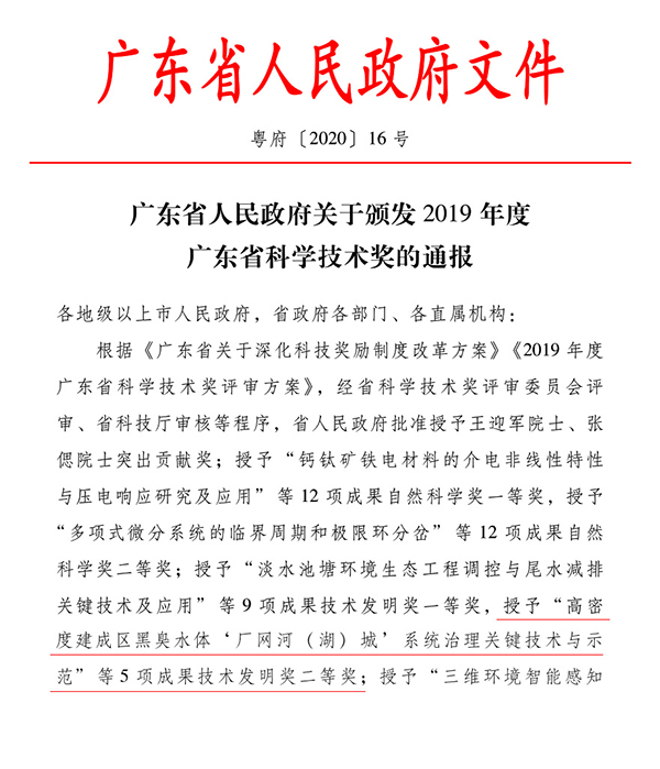 2019年9月,广东省工程勘察设计行业协会组织并推荐5个项目申报广东省科学技术厅2019 年科学技术奖。经广东省科学技术奖评审委员会评审,2020年2月28日,广东省发布2019省科学技术奖通报(粤府〔2020〕16号),“高密度建成区黑臭水体‘厂网河(湖)城’系统治理关键技术与示范”荣获省科学技术发明奖二等奖。