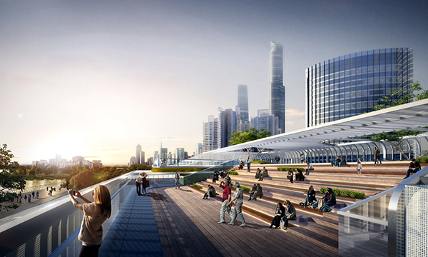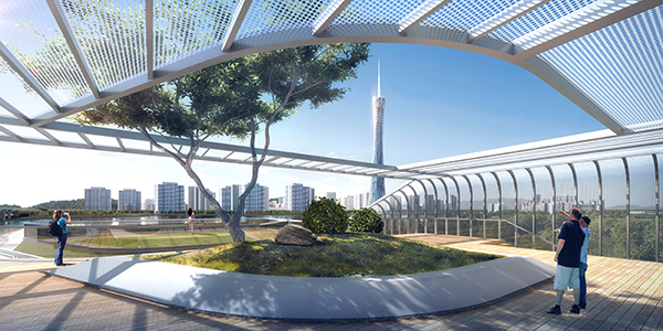 设计团队秉承 “提高城市设计水平,增强公共参与城市建设新路径”的设计理念,在充分考虑社会性景观诉求因素的前提下,结合传统美学,以层层退台的建筑形式面朝珠江,结合城市景观特色形成北高南低的建筑姿态,增强建筑物立体感,使建筑物融入周围景观呼应珠江景色。