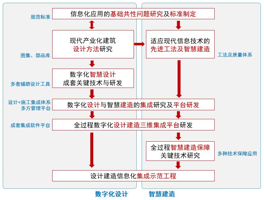 建筑全过程数字化智慧建造关键技术研究与应用:本项目创建了数字化智慧建造设计体系,研发出标准化构件部品库、户型平面组合库、新型节点、智能设计平台,编制行业标准,解决了标准化设计、全过程正向设计和数据共享、设计标准等关键问题,推动了工程设计向数字化转变。创建了数字化智慧建造生产体系,编制智能建造施工标准、研发与智慧建造配套的施工工法、设备、管理模式,研制出多种建筑用智能测量、3D打印、加工装配装备、工艺管理平台,解决了智慧建造技术的落地应用难题。创建了覆盖全产业链的集成体系,编制数字化交付标准,研制成套建筑工程数字化设计建造软件,建立建筑物智慧运维物联体系,开发工程建造数字化管理平台,实现设计-施工-运维全过程信息化集成应用。本项目实现建筑“绿色化、智慧化、工业化、信息化”的发展理念,推动工程建造向数字化转变。