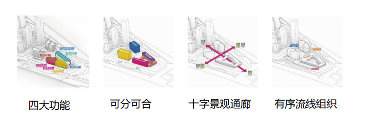 大湾区科学论坛(Greater Bay Area Science Forum,缩写GSF)由会议中心、科技馆、科创中心及科学家公寓四大功能组成,地上总建筑面积约11万平方米,其中会议中心及科技馆约4万平方米,科创中心及科学家公寓约7万平方米。出于对使用与分期的考量,将功能联系密切的学术中心与科技馆合并为一个高效的整体,科创中心与科学家公寓则各自独立建设,三个建筑单体既独立运营同时又密切联系。城市空间设计上,布局呼应西侧城市节点,景观视线向东穿越楼体,与南北绿轴形成十字景观通廊。天际线随建筑缓降,逐级共享岛尖美景。各建筑单体拥有独立的交通体系,高效便捷。