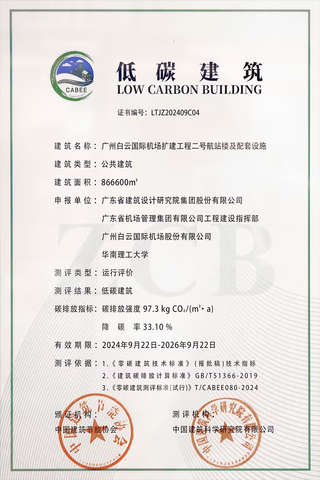 申报项目广州白云国际机场扩建工程二号航站楼项目获全国首批零碳建筑评价(低碳建筑等级)。