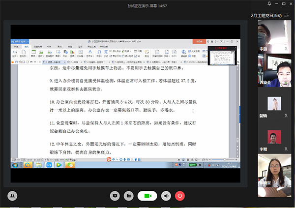 支部书记李蔚肯定了大家的学习成果,就疫情期间以及下一阶段工作进行了部署,提醒大家疫情情况趋于向好,但更要警惕麻痹思想、侥幸心理,必须继续做好各项防护工作。同时支部党员要快速适应线上办公新模式,作为中坚力量,在推动项目进展方面发挥中流砥柱的作用,努力完成全年的生产目标。