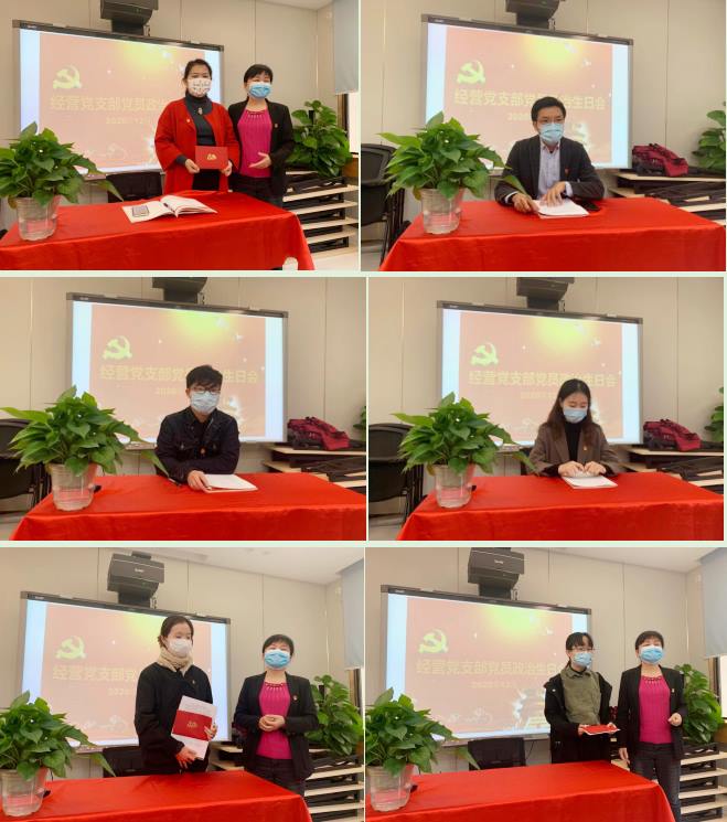 活动过程中,经营党支部书记苏素华为历年以来12月份入党的12位同志送上了精致的政治生日贺卡,热情洋溢的政治生日贺词,使人心潮澎湃。刘雨菡、李颖龙、王晓儿、秦帅、易莹、张宇蕾6位党员重温了入党初心,畅谈了入党期间的感想,深情回顾了入党以来的工作成长历程,分享了自己的心得体会。大家一起忆当初、话今日,无不深受触动。党支部书记苏素华对6位党员的分享予以肯定,寄语全体党员牢记入党誓词,在工作中发挥好党员的先锋模范作用,永远保持共产党员的先进性。