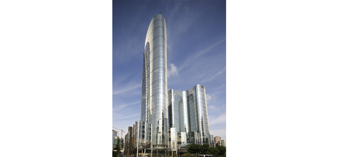 广州天河商业圈兴建的广州索菲特圣丰广场,是一个集五星酒店((索菲特酒店)、甲级办公楼、商业等为一体的大型综合体项目。酒店、办公塔楼相邻布置,共同围合出入门前广场。办公塔楼采用微纺锤形剖面设计,以椭圆形平面为蓝本逐层收分,高耸而挺拔。酒店以“L”形平面和写字楼组合相互呼应,以流动的线条勾画出优美动感的造型,充分体现了现代建筑的特征,同时也塑造了优雅大气的整体形象。索菲特圣丰广场为大底盘双塔楼结构,办公塔楼属高度超限建筑,框架柱全部采用大直径钢箮混凝土柱;大底盘裙楼柱距均较大,局部柱距达20米以上;采用钢-混凝土组合结构新技术。另外项目还使用大量能减少对环境带来负荷的新技术、新设备,以实现绿化环境目标。如设计了可通风换气的玻璃幕墙和门窗,尽可能地提高建筑室内的舒适度,最大限度地满足非空调状态下的自然通风效果。办公部分采用冷凝水全热回收技术,把多余的能耗回收并利用起来。还有冷交换热泵供水系统、节水洁具、智能电气系统等,不仅提高了项目本身对于能源利用的效率,同时也减少项目营运的能耗和成本。