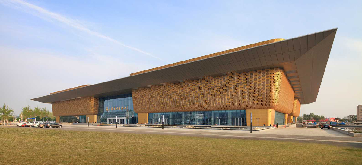在泰城时代发展轴线的中部,兴建泰山会展中心,这是一座以会议、展览为主的现代化会展建筑。其中展览部分包括有一个4000平方米的特殊展厅、一个9000平方米综合展厅及两个4500平方米综合展厅,会议中心部分则由一个1250座剧场式会议厅、一个300座报告厅、一个多功能宴会厅、八个小型会议厅组成。另外配套了可停放477辆轿车的地下停车库。泰安市是中国著名的历史文化名城,如何在建筑形态上表达出泰安丰厚的文化底蕴是本项目在建筑设计专业上的难点和挑战。纵览泰安历史,自尧舜至秦汉,直至明清,泰山都是历代帝王祭天的神山,而鼎正是中华民族祭天最重要的礼器,所以建筑整体外观设计以祭天金鼎为母题,分别用四座鼎作为四个功能区的体量外观,以“盛世金鼎”的整体造型突岀泰安市历史文化名城的鲜明形象。外立面则采用一次冲压成形的祥云图形铝合金格栅构件,通过参数化计算形成渐变的排列形式,为四个巨鼎刻画出丰富的表情肌理。本项目布局紧凑,同时增大了单个展厅面积,提高了展厅使用的灵活性,另外布展方式力求简单直接,方便明了。特别是重点考虑了会展与两会期间共享中庭可分可合的灵活分配,既保证了会议期间的高规格,也保证了会展期间共享空间的完整,解决了会展与会议不同功能使用上的管理问题。本建筑的主要功能布局以展厅为主,都是大空间层高都在6-8米以上,但是与展厅配套使用的还有很多其他功能的小房间,例如卫生间、洽谈室、茶水间以及为展厅配套的空调机房等。为了协调不同尺度空间的关系,使大空间更纯粹完整,我们在展厅两侧分别设置了两条跨度6米的辅助空间带,把辅助空间放置其中。并且利用夹层设置空调机房,使大小空间的结合更合理有序。
